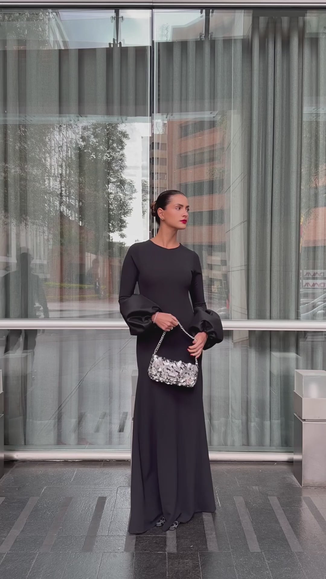 Long dress crafted in crepe, featuring an A-line silhouette and taffeta details on the sleeves that add structure and contrast.