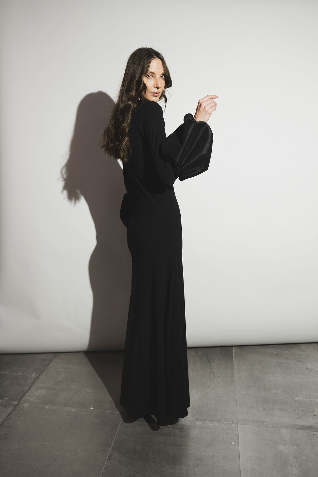 Long dress crafted in crepe, featuring an A-line silhouette and taffeta details on the sleeves that add structure and contrast.